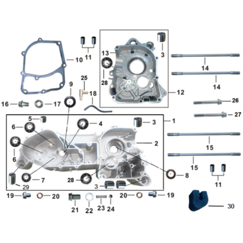 Блокот на моторот ја претставува основната конструкција на агрегатот и ги носи сите клучни внатрешни компоненти на моторот. Во оваа категорија се вклучени лев и десен блок на моторот, лежишта, семеринзи, диhtunzi, селен блокови, завртки, подлошки и придружни елементи, кои обезбедуваат правилно центрирање, заптивање и стабилна работа на моторот.