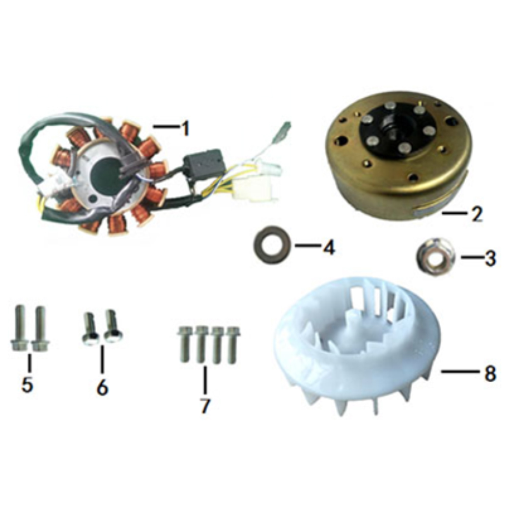 Електриката и системот за ладење ги опфаќаат компонентите задолжени за производство на електрична енергија, палење и одржување на оптимална работна температура на моторот. Во понудата се навои, магнет, вентилатор за ладење, како и придружни завртки, навртки и подлошки, кои заедно обезбедуваат сигурна работа на електричниот систем и ефикасно ладење на моторот.