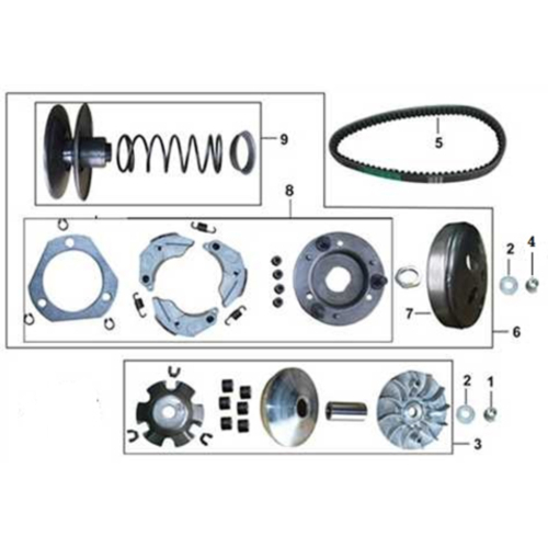 Преносот и вариоматот ги опфаќаат клучните компоненти задолжени за пренос на силата од моторот до задното тркало кај скутери и ATV возила. Системот вклучува преден и заден вариомат, квачило, погонски ремен, ѕвонче на квачилото, како и придружни навртки и подлошки, кои заедно овозможуваат мазно забрзување, оптимален пренос на сила и стабилна работа на возилото во сите режими на возење.