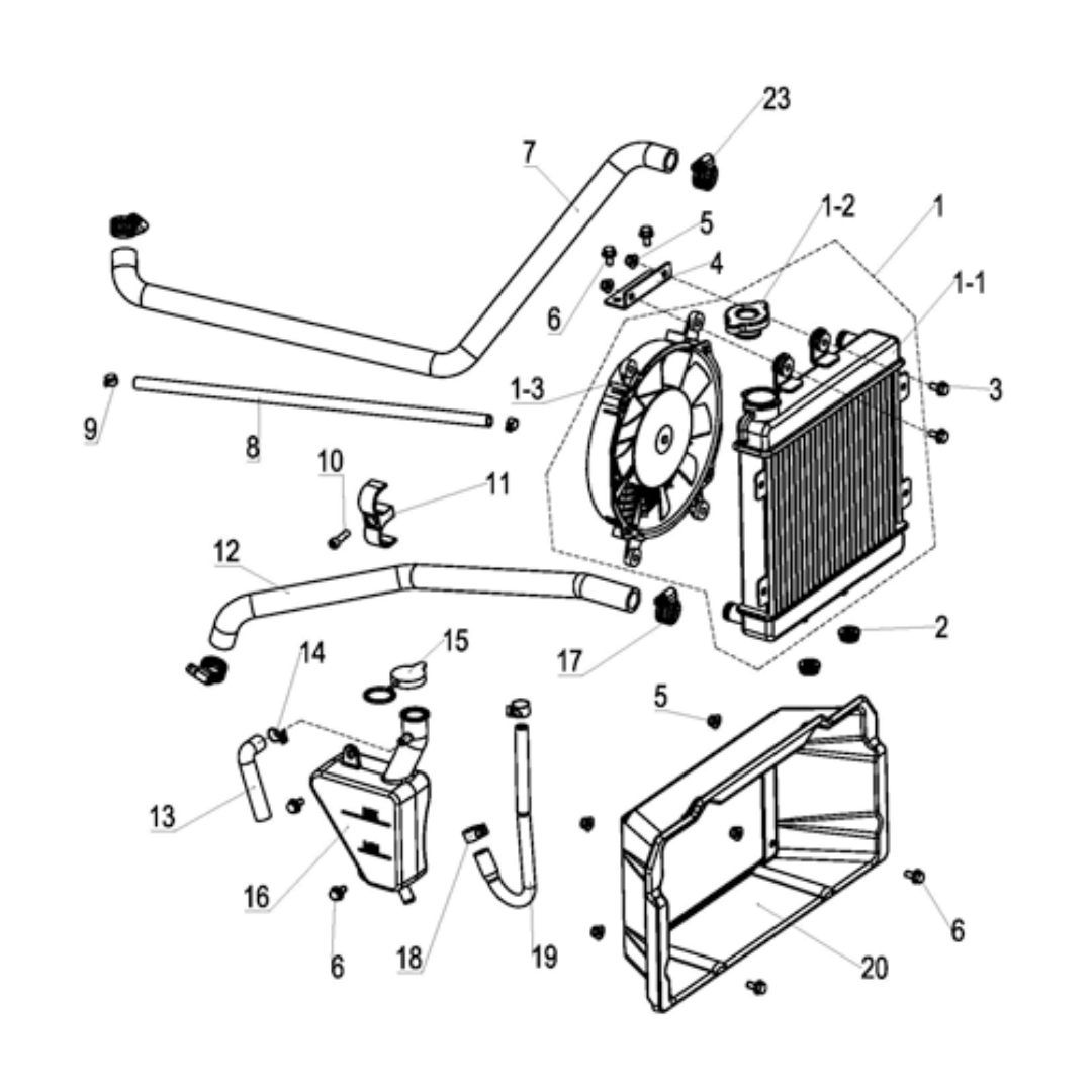 Комплетниот склоп на резервоар за ладилна вода за T LANDER 300 вклучува главен резервоар, експанзиска посуда со капак, сигурносен притисочен вентил, вентилатор за ладење, доводна и одводна цевка за вода, мала циркулирачка цевка, цевка за воздух на експанзиската посуда, осигурувачи и стеги, плочи и спојници за монтажа, заштита на резервоарот, како и сите потребни завртки и навртки. Овој сет обезбедува сигурно ладење на моторот, стабилен проток на ладилната течност и долготрајност на вашиот T LANDER 300.