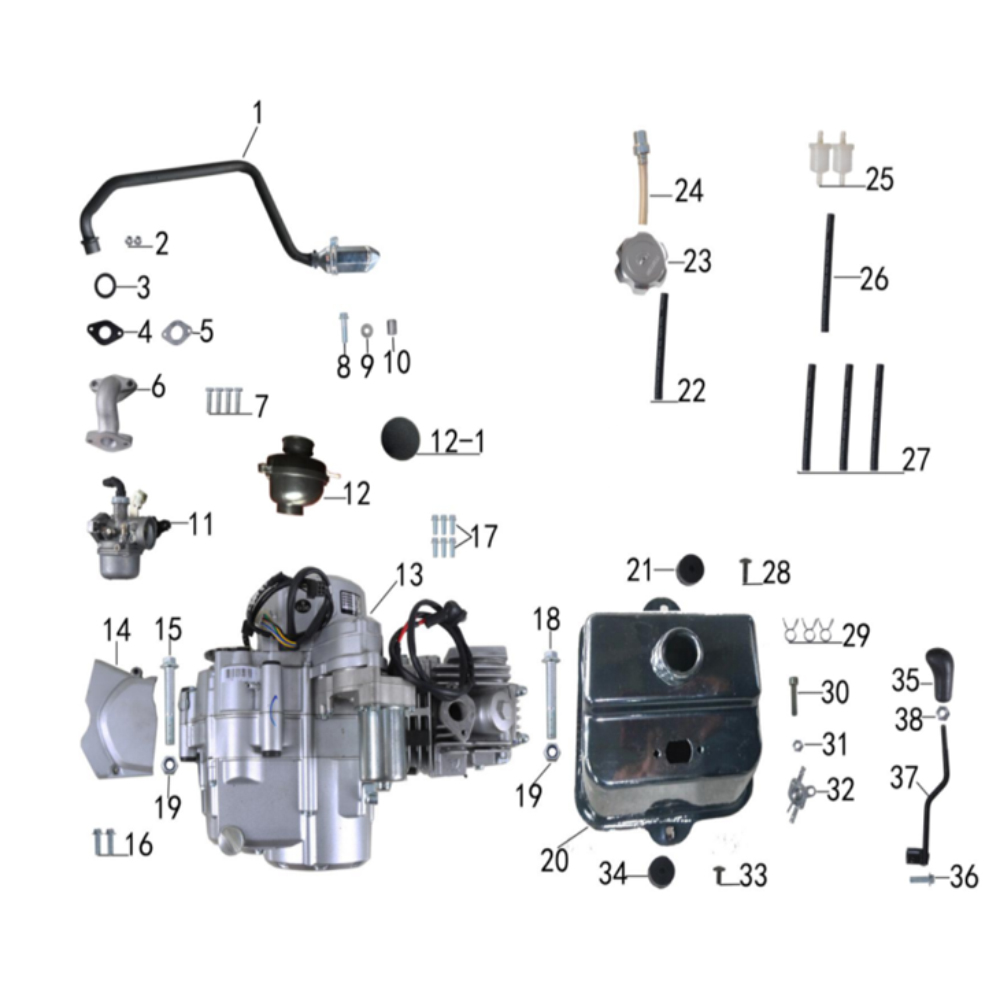 Системот на моторот на SHARK 125 ATV моделот (TAO MOTOR) ја претставува „срцето“ на возилото, задолжено за моќ, погон и ефикасна работа на целиот систем. Составен е од мотор со балансна осовина која обезбедува стабилна и тивка работа, карбуратор кој го контролира соодносот на гориво и воздух, како и филтри за воздух и гориво кои гарантираат чисто и оптимално снабдување на моторот. Усисната и издувната цевка, заедно со алуминиумскиот ауспух, овозможуваат ефикасен проток на гасовите, додека резервоарот за гориво, вентилот и доводните цевки обезбедуваат стабилно снабдување со гориво. Системот вклучува и рачка и шипка на менувачот, прекинувач за масло, како и низа заптивки, навртки и завртки кои заедно обезбедуваат прецизно и долготрајно функционирање на сите компоненти на моторот.
