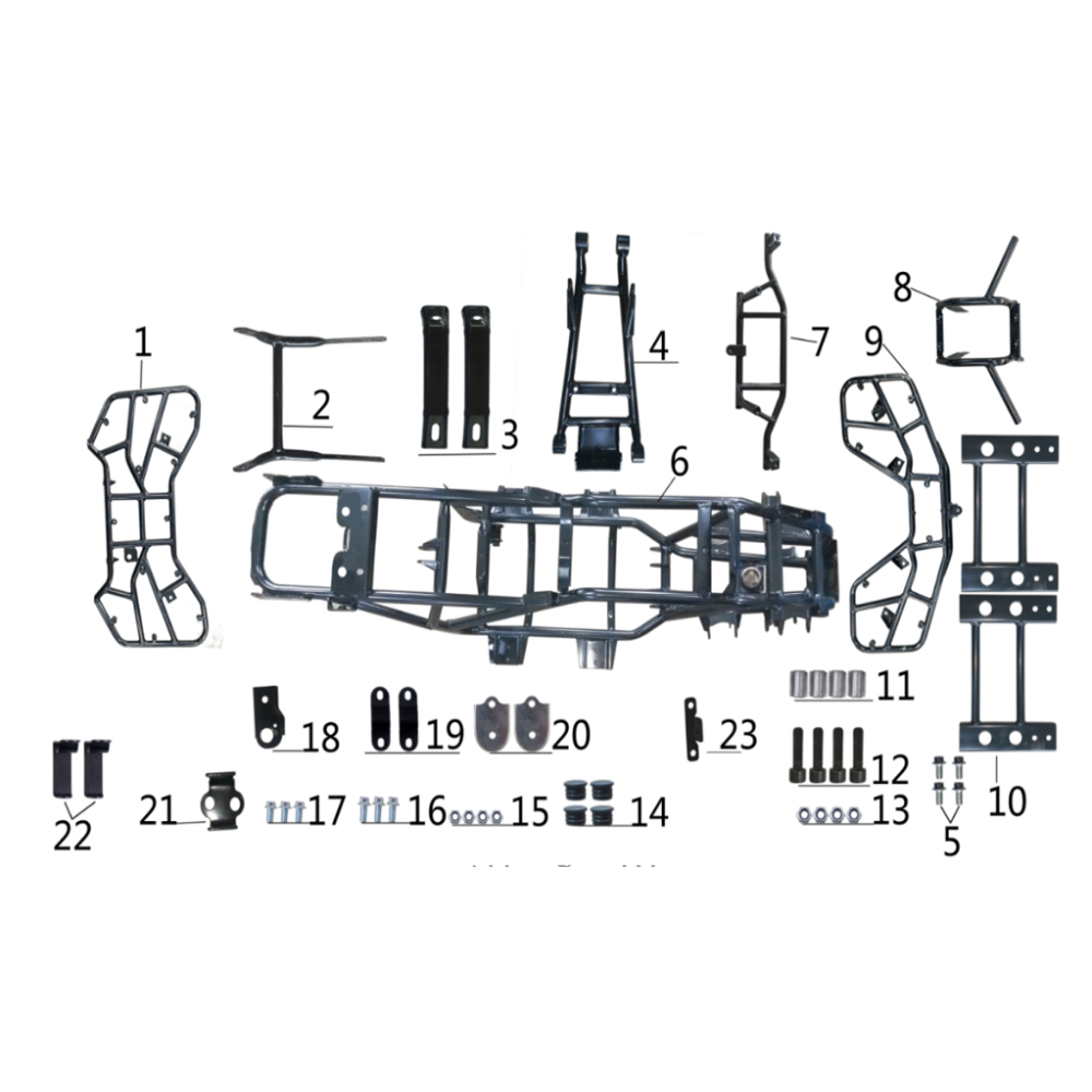 Системот на рамката за SHARK 125 ATV моделот (TAO MOTOR) ја претставува основната конструкција на возилото која ги поврзува сите главни компоненти и обезбедува цврстина и стабилност за време на возењето. Составен е од рама (главна рамка на возилото), предни и задни носачи, ослонци за нозе, преден браник, како и носачи за моторот и електричните компоненти. Во склопот на системот се вклучени и различни завртки, навртки, чепови, дистанциони чаури и потпорни елементи, кои овозможуваат сигурно фиксирање и стабилно функционирање на сите делови. Овој систем обезбедува цврста основа за поставување на моторот, ослонувањето и деловите на каросеријата, нудејќи оптимална рамнотежа и сигурност на возилото.