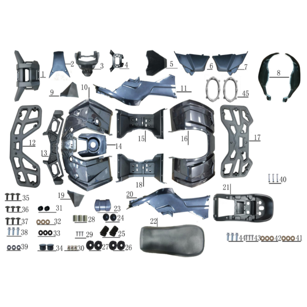 Системот на покривки на SHARK 125 ATV моделот (TAO MOTOR) ги опфаќа сите заштитни и декоративни елементи кои го обликуваат изгледот на возилото и ги штитат неговите внатрешни компоненти. Во конструкцијата се вклучени предни и задни пластични делови на каросеријата, странични облоги, капаци на бројчаникот, рамка на светлата, капак на резервоарот за гориво, како и предни и задни полици на носачите, кои заедно му даваат на возилото препознатлив дизајн и функционалност.