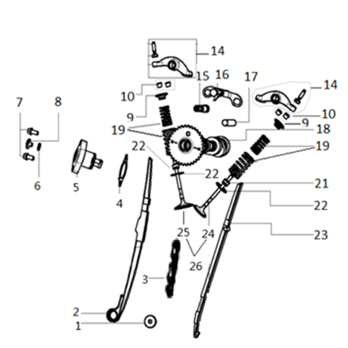 Системот за распоред на вентили вклучува завртка за затегање, плоча за затегање на ланецот, запчан ланец, заптивка на затегачот, комплет затегач, заптивен прстен, шестострана завртка со прирабница, затегачка завртка, носач на пружината на вентилот, клуч за вентил, склоп на рампа на вентилите, осовини на лостот на вентилите, склоп на гранична плоча на главата на цилиндерот, сад за собирање масло, прстен на седиштето на пружината, плоча за водич на ланецот, издувен и усисен вентил, како и комплет вентили.