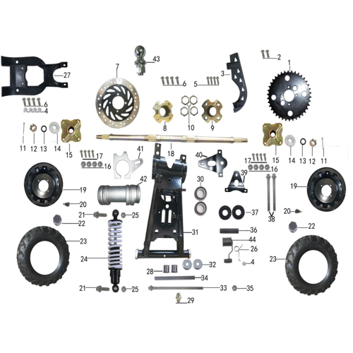 Целиот склоп на задното ослонување ги опфаќа сите клучни компоненти кои овозможуваат стабилност, безбедност и удобност при возење. Од задната осовина, вилушка и амортизери, до диск сопирачка, фелни и запчаник – секој дел е прецизно изработен за да обезбеди оптимални перформанси и долговечност на вашето ATV возило.