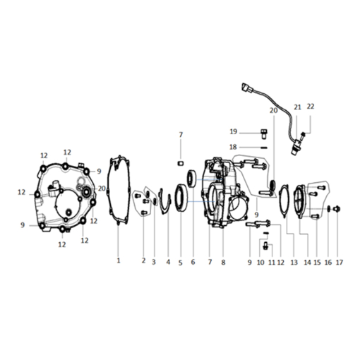Комплетот за склоп на кутијата на менувач на T LANDER 300 вклучува преносна кутија, носива плоча, лежишта, пин за позиционирање, заптивки и заптивки за куќиштето на менувачот и капакот, шестострани завртки со прирабница, чеп за испуштање масло, маслена заптивка и сензор за брзина. Сите елементи се прецизно изработени за да обезбедат сигурна работа, оптимален пренос на моќноста и долготрајност на менувачкиот систем на вашиот T LANDER 300.